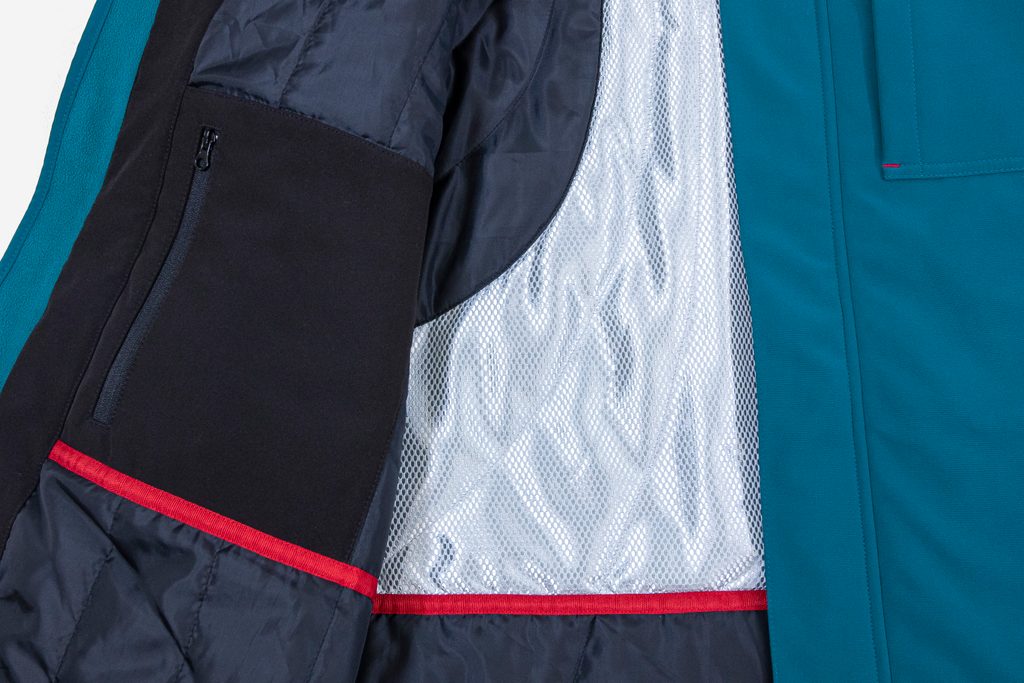 Jachetă - geacă de iarnă softshell pentru bărbați cu glugă, care are un softshell izolat în 3 straturi cu membrană TPU. Partea din spate a jachetei este ușor alungită, conturată și are o zonă termo reflectorizantă pentru a reflecta și reține căldura în interior. Fermoarul este pe toată lungimea, cu protecție pentru bărbie și clapetă. Gluga este căptușită și detașabilă. Gluga și tivul jachetei pot fi ajustate cu ajutorul unui cordon elastic. Tivurile mânecilor are reglabile cu Velcro. Are în total 5 buzunare. 2 buzunare laterale cu fermoar, 2 buzunare cu fermoar în piept protejate de clapete și 1 buzunar interior în piept, de asemenea cu fermoar.