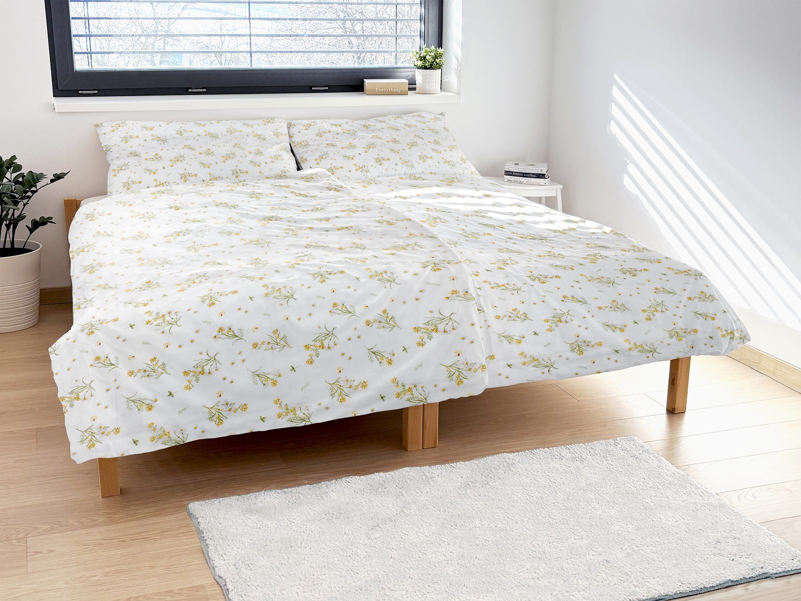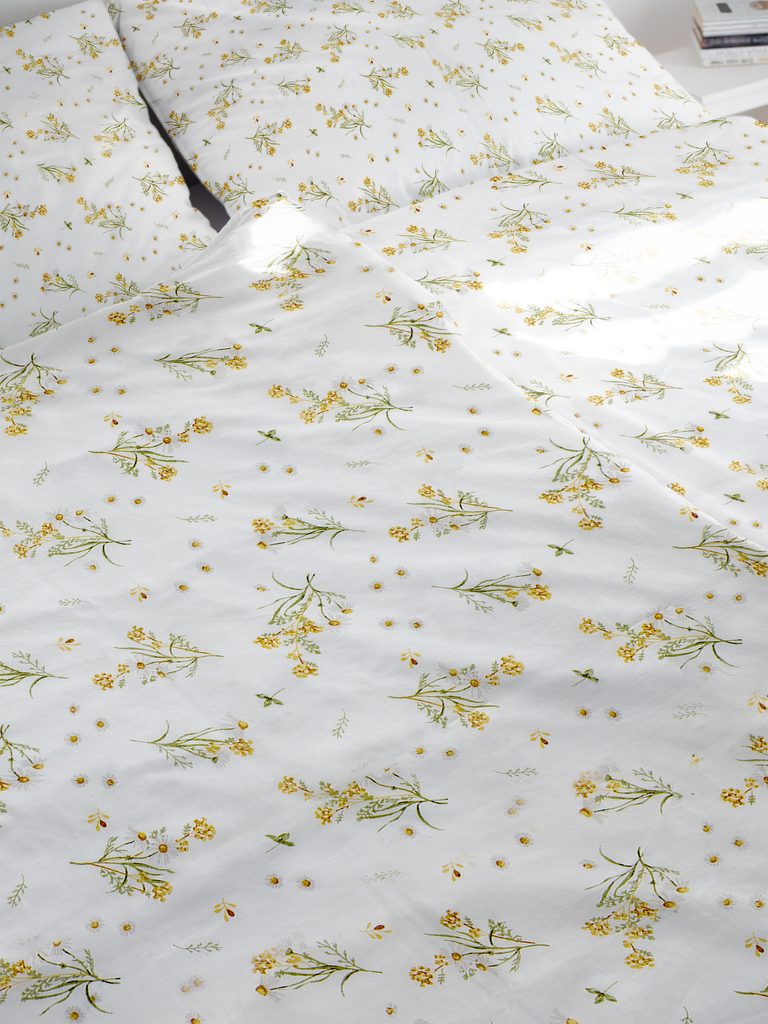Lenjerie de pat din bumbac de calitate, cu model fin de flori mici. Imprimeul precis și densitatea mare a țesăturii garantează culori vii chiar și după numeroase spălări.
