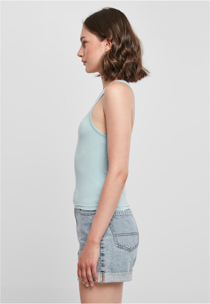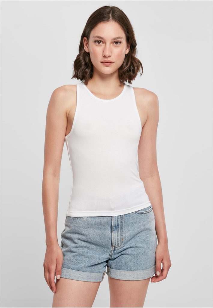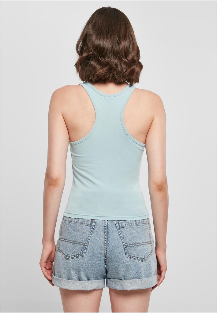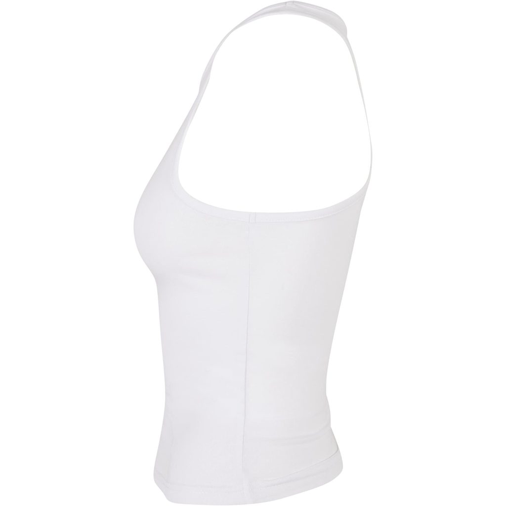 Top la modă fără mâneci, cu spate racer, cu croială slim-fit care evidențiază silueta feminină. Are un decolteu rotund și o lungime totală mai scurtă. Material: 95 % bumbac, 5 % elastan; 180 g/m2