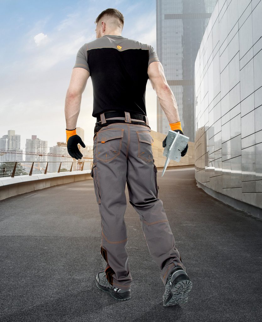 Salopete de lucru în talie cu o lungime extinsă de 183-190 cm.Acestea sunt confecționate dintr-un material compozit de cusătură twill de înaltă calitate: 60% bumbac, 40% poliester cu o greutate de 260 g/m2. Pantalonii au un stil sportiv de blugi și o croială potrivită pe statură. Liniile verticale copiază figura, pe spate există cusută o șa și două buzunare cusute cu picior și au genunchi dubli cu buzunar pentru genunchiere. Buzunarele pentru scule sunt stratificate pe părțile laterale ale coapselor. Originalul este, de asemenea, imprimeu reflectorizant argintiu, accesorii și cusături de contrast cu fir denim.
