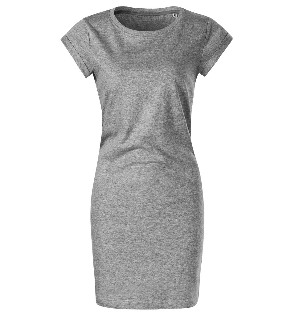 Rochia-tricou pentru femei este confecționată dintr-un bumbac foarte plăcut, confortabil chiar și în zilele călduroase de vară. Ea are o croială largă, dreaptă, și o lungime până la genunchi. Mânecile rulate sunt la modă și se termină cu o cusătură în 4 puncte. Decolteul este ceva mai adânc și destul de rotund. Decolteul are un tiv îngust cu 5% elastan pentru o îmbrăcare mai ușoară, iar partea interioară a decolteului este finisată cu o bandă gri. O bandă de întărire trece de la umăr la umăr pentru a menține rochia în formă după multe spălări.