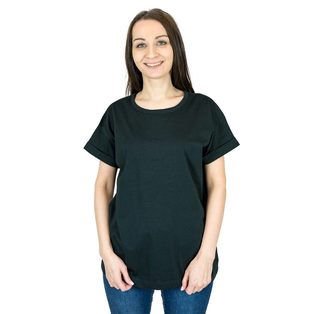 Tricou pentru femei modern, cu mânecă scurtă, confecționat din bumbac organic de calitate, cu croială "boyfriend". Se caracterizează prin faptul că este larg, drept și, foarte confortabil. Tricoul are mâneci ajustabile, umerii ușor căzuți, cusături laterale și etichetă practică care se rupe cu ușurință.